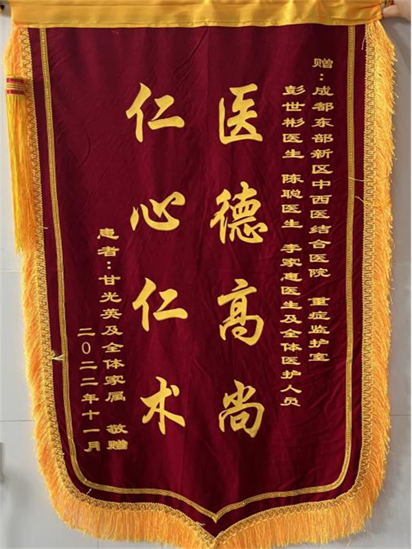 近日,患者甘婆婆的家屬激動地將一面印有“醫(yī)德高尚 仁心仁術”的錦旗送到成都東部新區(qū)中西醫(yī)結合醫(yī)院重癥醫(yī)學科主任彭世彬手中,感謝醫(yī)護人員對其母親就住重癥醫(yī)學科期間的精心救治和無微不至的護理。