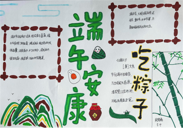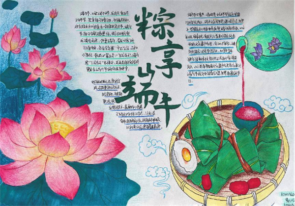 同學們充分發(fā)揮自己的聰明才智,精巧構思,精美構圖,創(chuàng)作出一幅幅畫面清新、設計精美的手抄報。大家制作的手抄報內(nèi)容豐富,圖文并茂,或粽葉飄香,或荷花綻放,或龍舟競渡,展現(xiàn)了濛中學子積極進取、昂揚向上的精神風貌。