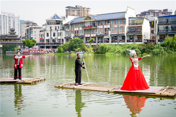 (非遺技藝“獨(dú)竹水上漂”正在上演。綏寧宣傳部供圖)