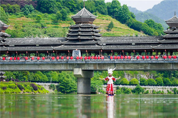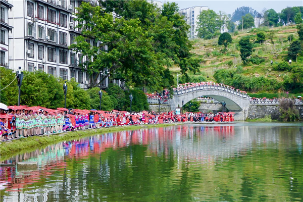 中國傳統(tǒng)村落花園閣村也是綏寧苗族聚居村落之一?;▓@閣村以“有一種幸福叫回娘家”為主題,精心策劃了一系列民俗活動(dòng)?!跋不啬锛摇泵袼妆硌菔墙衲旯媚锕?jié)的重頭戲,它展示了苗族女性回娘家的喜悅和幸福。百名身穿苗族節(jié)日盛裝的姑娘穿過風(fēng)雨橋,形成一道亮麗風(fēng)景。
