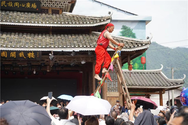 (花園閣國家濕地公園“上刀山”傳統(tǒng)的技藝展示。李深德 攝)