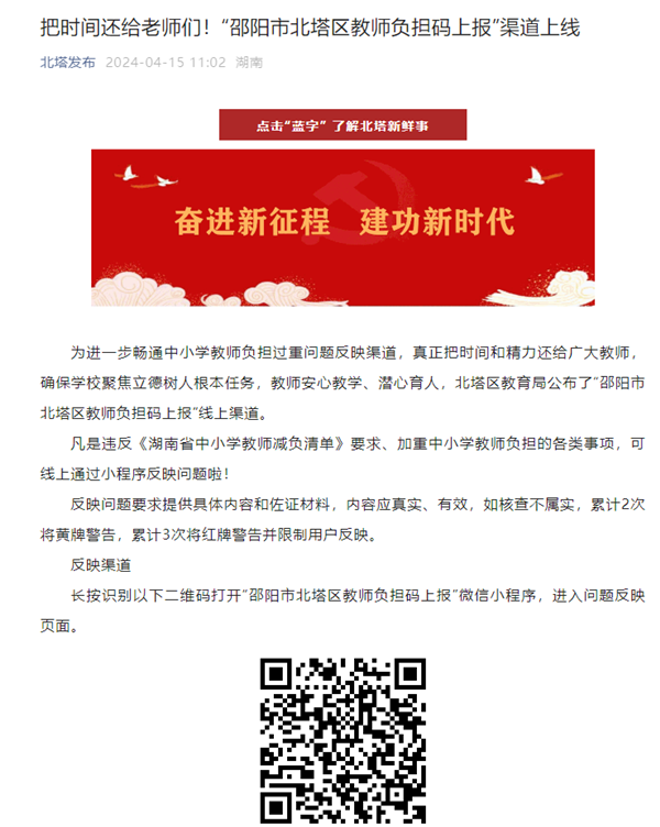 為真正把時(shí)間還給老師,今年4月,北塔區(qū)教育局建立了“邵陽市北塔區(qū)教師負(fù)擔(dān)碼上報(bào)”小程序和電話舉報(bào)的渠道,在“北塔發(fā)布”公眾號的監(jiān)督舉報(bào)欄目上公布,接受師生、群眾和社會的監(jiān)督。(通訊員:鄧佳、何芳、劉鵬)