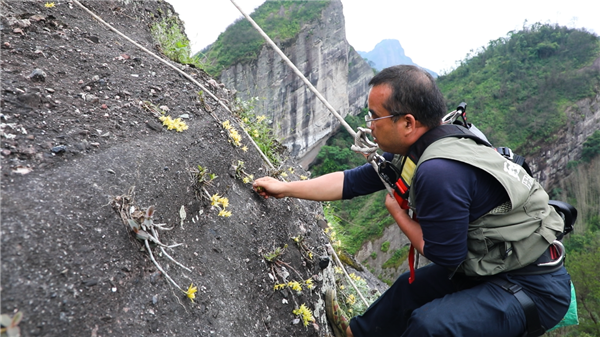 在黃背村海拔500米仿野生鐵皮石斛種植基地的崀山崖壁上,一簇簇淡黃色的鐵皮石斛花依附在崖壁表層,根莖緊貼著崖壁,仿佛在聆聽(tīng)大自然的心跳,微風(fēng)輕拂,石斛花朵散發(fā)出淡淡清香。采摘工人在安全繩索的保護(hù)下,貼著懸崖緩緩下降,精心采摘盛開(kāi)的鐵皮石斛花。