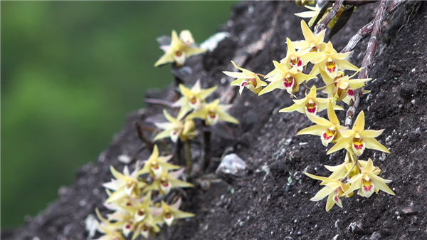 湖南新寧:50萬(wàn)株“生態(tài)瑰寶”鐵皮石斛盛花扮靚丹霞崖壁