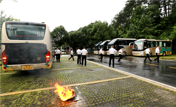 本次“崀山景區(qū)交通運(yùn)輸消防應(yīng)急救援演練”活動(dòng)由崀山管理局安委會(huì)、新寧縣崀山交警中隊(duì)、縣道路運(yùn)輸服務(wù)中心現(xiàn)場指導(dǎo),崀山盛源公司觀光車隊(duì)具體實(shí)施。活動(dòng)現(xiàn)場,模擬觀光車在行駛途中因油、電路故障導(dǎo)致發(fā)動(dòng)機(jī)起火,駕駛員減速靠邊停車后,第一時(shí)間組織車上所有乘客緊急下車,疏散轉(zhuǎn)移到安全區(qū)域。駕駛員立即向現(xiàn)場指揮報(bào)告情況,指揮長命令:啟動(dòng)車隊(duì)消防應(yīng)急預(yù)案,立即開展火災(zāi)撲救和應(yīng)急救援工作。必要時(shí)向交通、消防、120急救中心等相關(guān)部門報(bào)告火災(zāi)現(xiàn)場情況。于是,各項(xiàng)物資迅速到位,應(yīng)急救援小組依次緊急集合趕赴現(xiàn)場,按照演練要求和工作職責(zé),展開火災(zāi)撲救和應(yīng)急救援行動(dòng)。在確認(rèn)車上所有乘客疏散至安全區(qū)域,完成了傷員的救治、轉(zhuǎn)運(yùn)工作,且火情得到全部控制,沒有發(fā)現(xiàn)新的火源,并完成了現(xiàn)場清理工作后,總指揮對(duì)本次演練活動(dòng)進(jìn)行講評(píng),隨后宣布演練結(jié)束。