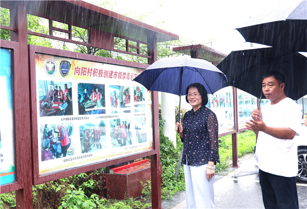 黃海蓉首先來(lái)到向陽(yáng)村一站式便民服務(wù)大廳,了解禁毒會(huì)員小組辦公配備和工作開(kāi)展情況,實(shí)地察看該村禁毒宣傳長(zhǎng)廊,聽(tīng)取該村禁毒工作情況匯報(bào),并向禁毒專(zhuān)干、駐村輔警了解涉毒人員動(dòng)態(tài)管控等情況。近年來(lái),向陽(yáng)村堅(jiān)持以黨建為引領(lǐng),充分發(fā)揮“四長(zhǎng)”作用,大力開(kāi)展禁毒宣傳教育,營(yíng)造良好的拒毒防毒環(huán)境,實(shí)現(xiàn)社戒社康中風(fēng)險(xiǎn)涉毒人員清“零”,成功創(chuàng)建市級(jí)禁毒示范村。黃海蓉對(duì)該村禁毒工作取得的成績(jī)表示高度肯定。