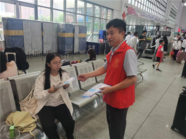 在高鐵站發(fā)放《拒絕藥物濫用》等宣傳資料