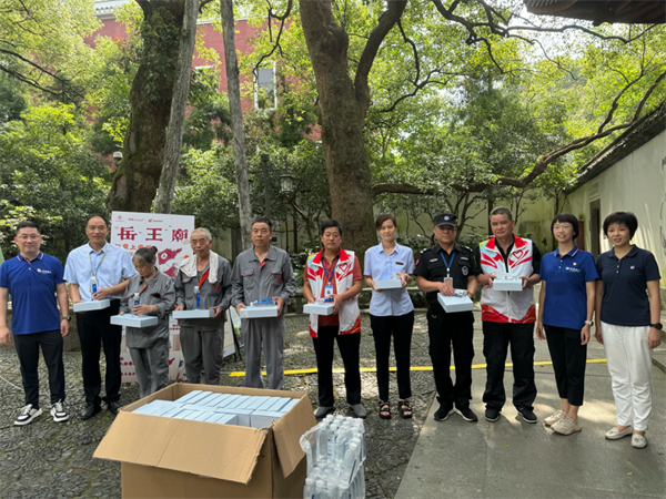 活動(dòng)在岳廟管理處驛站——志愿服務(wù)微笑亭舉行,黨員干部們化身為“藍(lán)衣戰(zhàn)士”,為炎炎夏日中堅(jiān)守崗位的環(huán)衛(wèi)人員、安保人員、售票人員等送上了定制水、降溫冰貼、花露水、防曬帽等清涼用品?;顒?dòng)中,共計(jì)為岳廟管理處管轄范圍西湖核心景區(qū)的工作人員送上了200余份清涼與慰問(wèn)。