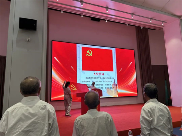 全體黨員在莊嚴(yán)的氛圍下下合唱《我和我的祖國(guó)》,歌聲嘹亮,情感真摯,表達(dá)了對(duì)祖國(guó)的無限熱愛。