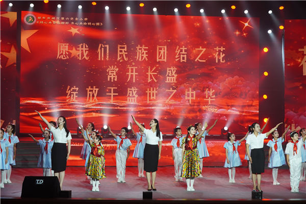 7月7日,在“中華民族一家親,石榴花開心向黨”為主題的民族團(tuán)結(jié)文化周聯(lián)歡晚會(huì)上,邵東市城區(qū)六完小師生出演《同心共育石榴籽齊心共繪同心圓》
