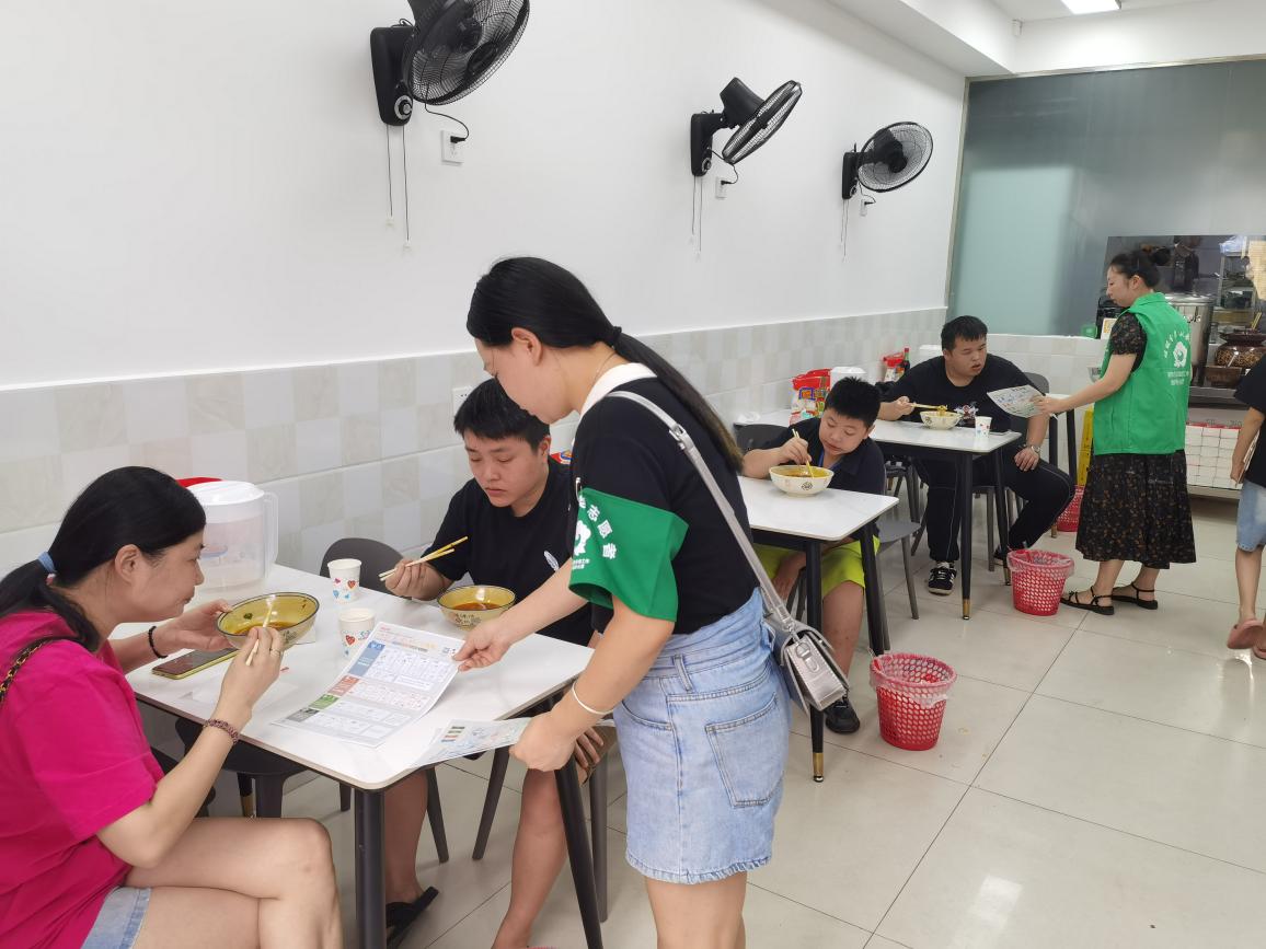 “非常抱歉打擾您的用餐時(shí)間,這是‘光盤(pán)行動(dòng)’宣傳單,希望你們能多向家人和孩子宣傳勤儉節(jié)約不浪費(fèi)的良好風(fēng)尚。”在街區(qū)的一家餐館里,志愿者們向正在用餐的顧客發(fā)放宣傳單,同時(shí)提倡吃多少點(diǎn)多少,打包剩飯剩菜。為了不影響顧客用餐,志愿者們發(fā)完宣傳單后迅速離開(kāi)。而在酒店中,志愿者在與酒店負(fù)責(zé)人取得聯(lián)系后,在酒店門(mén)口張貼了“光盤(pán)行動(dòng)”宣傳單,并向酒店工作人員宣讀“垃圾分類”口訣。