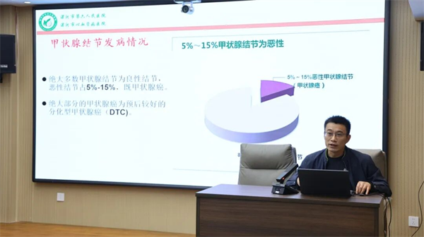 講座中,高洪軍副院長結(jié)合多年臨床經(jīng)驗,以通俗易懂的語言,圍繞《甲狀腺結(jié)節(jié)的誘因及防治》,系統(tǒng)講解了甲狀腺結(jié)節(jié)的發(fā)病原因、分類、臨床表現(xiàn)、檢查方式等內(nèi)容,特別針對辦公人群久坐、壓力大、作息不規(guī)律等易誘發(fā)甲狀腺問題的特點,重點分享了科學預(yù)防方法,包括合理飲食、規(guī)律運動、情緒調(diào)節(jié)等實用技巧。