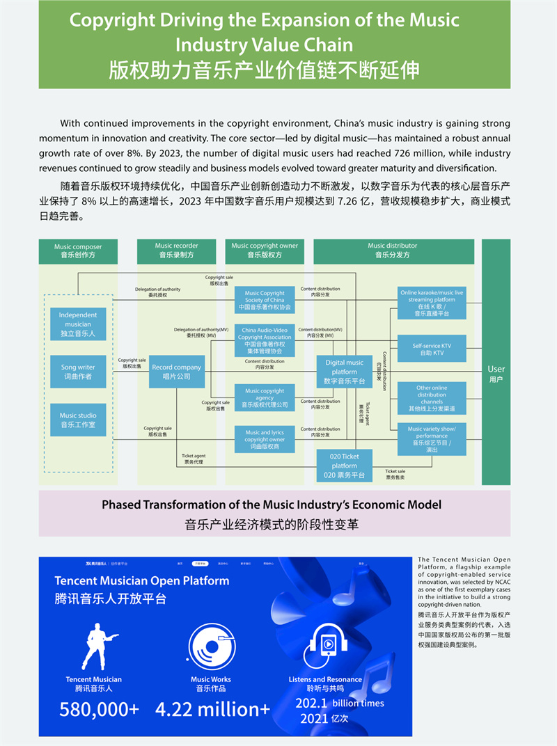 作為騰訊音樂(lè)在版權(quán)產(chǎn)業(yè)服務(wù)領(lǐng)域的重要實(shí)踐,騰訊音樂(lè)人開(kāi)放平臺(tái)憑借全鏈條版權(quán)保護(hù)、對(duì)原創(chuàng)內(nèi)容的多方位扶持,以及多元化、國(guó)際化的創(chuàng)新運(yùn)營(yíng)模式,成功入選了第一批版權(quán)強(qiáng)國(guó)建設(shè)典型案例。依托騰訊音樂(lè)內(nèi)容生態(tài)優(yōu)勢(shì),騰訊音樂(lè)人開(kāi)放平臺(tái)通過(guò)構(gòu)建全鏈條版權(quán)保護(hù)機(jī)制持續(xù)推動(dòng)音樂(lè)內(nèi)容正版化,保障音樂(lè)人權(quán)益;同時(shí)大力創(chuàng)新音樂(lè)產(chǎn)業(yè)商業(yè)模式和盈利方式,為音樂(lè)人提供更廣闊的發(fā)展空間,極大地促進(jìn)了優(yōu)質(zhì)原創(chuàng)音樂(lè)人和原創(chuàng)音樂(lè)作品的涌現(xiàn),體現(xiàn)了我國(guó)音樂(lè)版權(quán)環(huán)境的優(yōu)化持續(xù)激發(fā)創(chuàng)新創(chuàng)造動(dòng)力,助力音樂(lè)產(chǎn)業(yè)價(jià)值鏈不斷延伸。