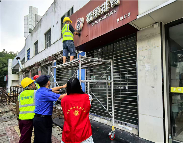 接到投訴后,茶亭社區(qū)秉持“民有所呼、我有所應(yīng)”的原則,立即啟動(dòng)“小事馬上辦”響應(yīng)機(jī)制,組織工作人員第一時(shí)間趕赴現(xiàn)場(chǎng)勘查。經(jīng)核實(shí),該區(qū)域戶外廣告及招牌因設(shè)置年限久遠(yuǎn),長(zhǎng)期經(jīng)受風(fēng)吹日曬雨淋,金屬框架已嚴(yán)重銹蝕松動(dòng),隨時(shí)可能發(fā)生高空墜落。更棘手的是,對(duì)應(yīng)商鋪均已撤租停業(yè),相關(guān)責(zé)任主體早已失聯(lián),屬于典型的“無主廣告”,常規(guī)處置流程難以快速推進(jìn)?!斑@些松動(dòng)的框架懸在人行道上方,來往行人絡(luò)繹不絕,哪怕一小塊部件掉落都可能釀成事故。”社區(qū)網(wǎng)格員在現(xiàn)場(chǎng)記錄時(shí)說道。為防止隱患擴(kuò)大,社區(qū)當(dāng)即安排志愿者在周邊設(shè)置臨時(shí)警示標(biāo)識(shí),疏導(dǎo)過往行人,為后續(xù)處置贏得時(shí)間。