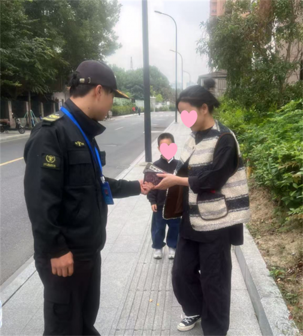 海寧市海洲街道綜合執(zhí)法梅園崗?fù)?,一位女士帶著一個(gè)小男孩,激動(dòng)地向海寧市海洲街道綜合行政執(zhí)法隊(duì)的市容管理人員道謝。