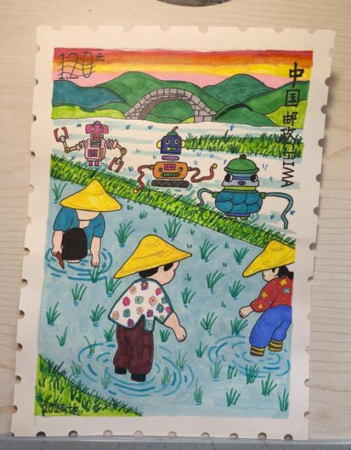 典禮現(xiàn)場特設(shè)優(yōu)秀作品展示區(qū),一幅幅浸潤著童真童趣的郵票設(shè)計(jì)佳作,以斑斕絢麗的色彩、巧思獨(dú)具的構(gòu)圖與純粹無瑕的視角,勾勒出孩子們心中的星河與遠(yuǎn)方——有對科技興農(nóng)的暢想,有對家國情懷的抒懷,有對自然萬物的描摹,引得現(xiàn)場來賓紛紛駐足凝視、細(xì)細(xì)品讀。